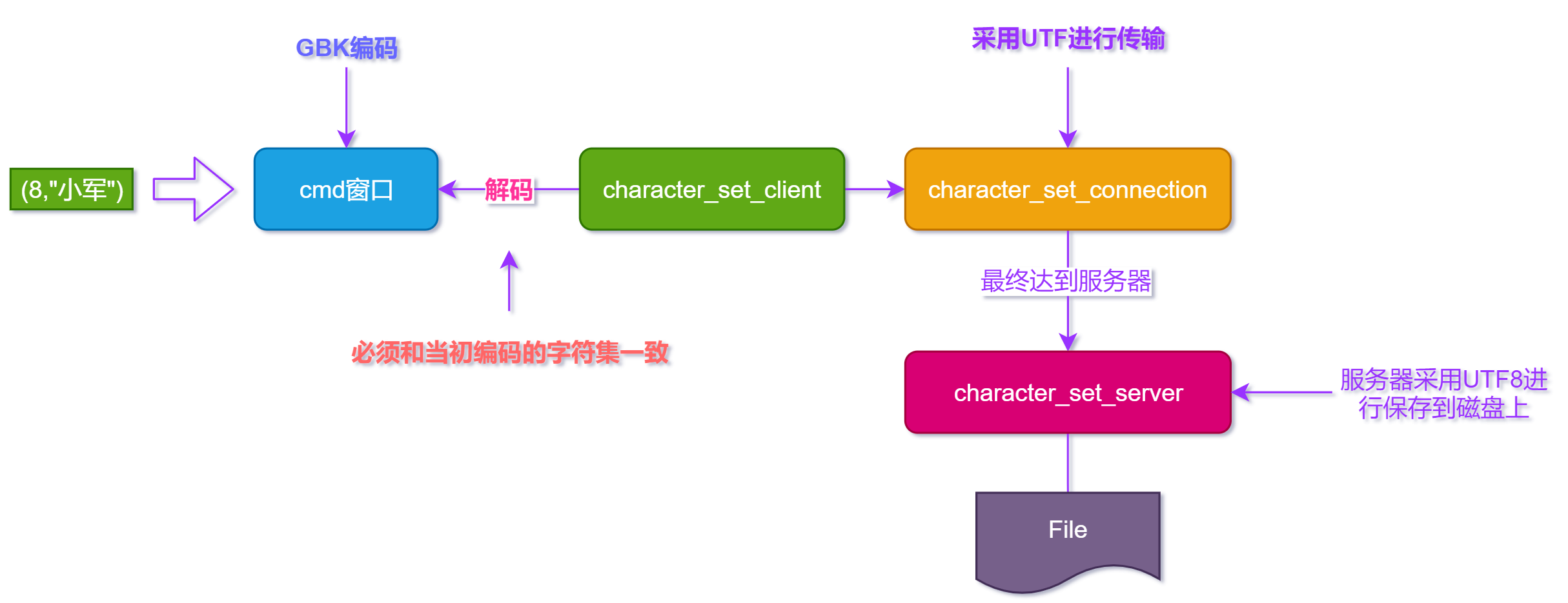 数据首先被cmd窗口编码,之后MySQL服务器会根据character_set_client解码,然后根据character_set_connection编码传递到MySQL服务器,MySQL服务器最终按照character_set_server编码进行存储;