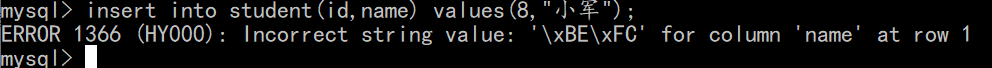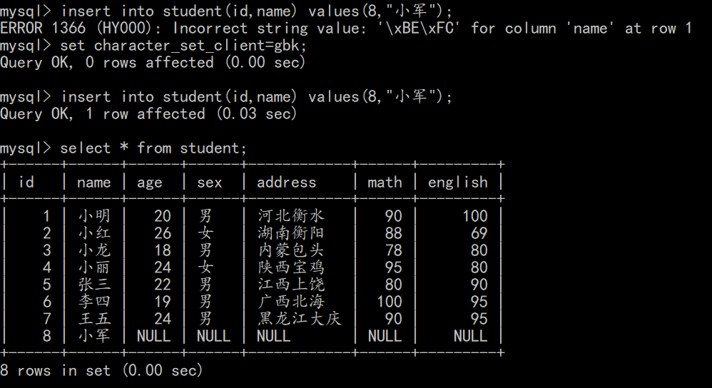 1 | insert into student(id,name) values(8,"小军"); |