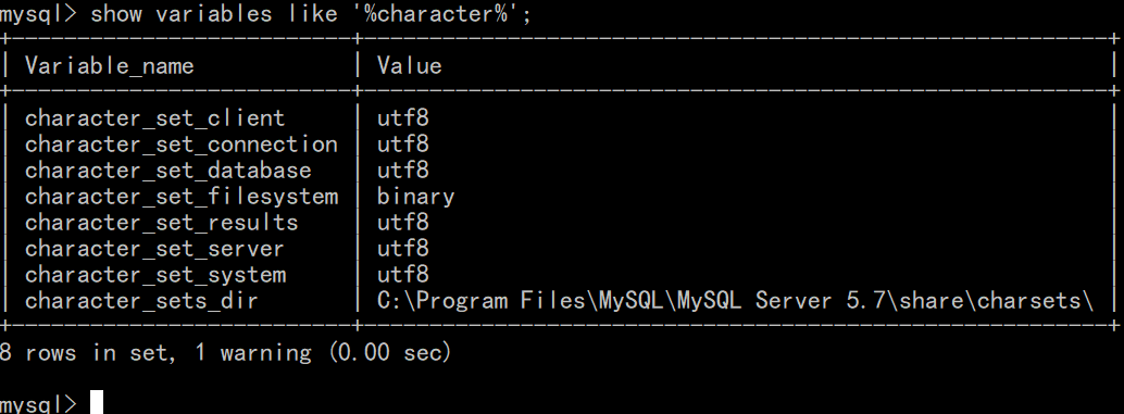 1 | show variables like '%character%'; |