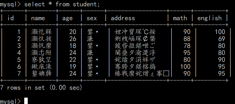 有的同学可能在MySQL控制台查询时,中文会出现乱码,如下图: