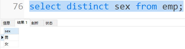 1 | select distinct sex from emp; |
