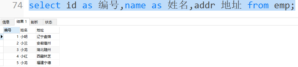 1 | SELECT 字段名1 AS 别名, 字段名2 AS 别名... FROM 表名; |