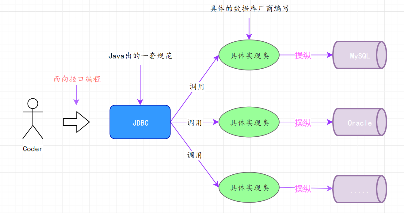 JDBC API是一组接口,没有具体的实现。实现类由各数据库厂商去实现。我们只需要调用接口中的方法即可。