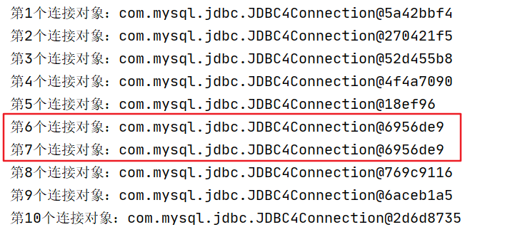 1 2 3 4 5 6 7 8 9 10 11 12 13 14 15 16 17 18 19 20 21 22 23 24 25 26 27 28 29 30 package com.dfbz.demo;import com.dfbz.pool.MyDataSource;import java.sql.Connection;public class Demo08_MyDataSource { public static void main (String[] args) throws Exception{ MyDataSource ds = new MyDataSource (); for (int i = 0 ; i < 11 ; i++) { Connection conn = ds.getConnection(); System.out.println("得到第" + (i+1 ) + "个连接" + conn); if (i==5 ) { ds.releaseConnection(conn); } } } }