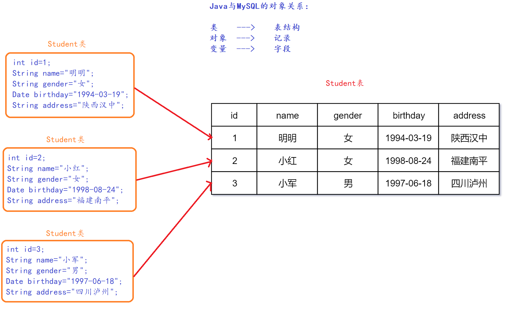 1 2 3 4 5 6 7 8 9 10 11 12 13 14 15 16 17 18 19 20 21 22 23 24 25 26 27 28 29 30 31 32 33 34 35 36 37 38 39 40 41 42 43 44 45 46 47 48 49 50 51 52 53 54 55 56 package com.dfbz.demo;import com.dfbz.entity.Student;import com.dfbz.utils.DataSourceUtils;import org.junit.Test;import java.sql.Connection;import java.sql.PreparedStatement;import java.sql.ResultSet;import java.util.ArrayList;import java.util.Date;import java.util.List;public class Demo10 { @Test public void test1 () throws Exception{ List<Student> stuList = new ArrayList <>(); Connection conn = DataSourceUtils.getConnection(); PreparedStatement ps = conn.prepareStatement("select * from student;" ); ResultSet rs = ps.executeQuery(); while (rs.next()) { int id = rs.getInt("id" ); String name = rs.getString("name" ); String gender = rs.getString("gender" ); Date birthday = rs.getDate("birthday" ); String address = rs.getString("address" ); Student student=new Student (id,name,gender,birthday,address); stuList.add(student); } DataSourceUtils.close(conn, ps, rs); for (Student student : stuList) { System.out.println(student); } } }