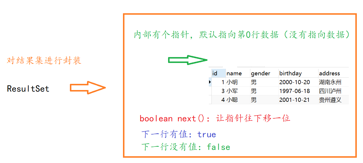 3.5 执行DQL操作 3.5.1 ResultSet接口: 作用:封装从数据库服务器中查询到的所有记录。从结果集对象中得到查询的数据